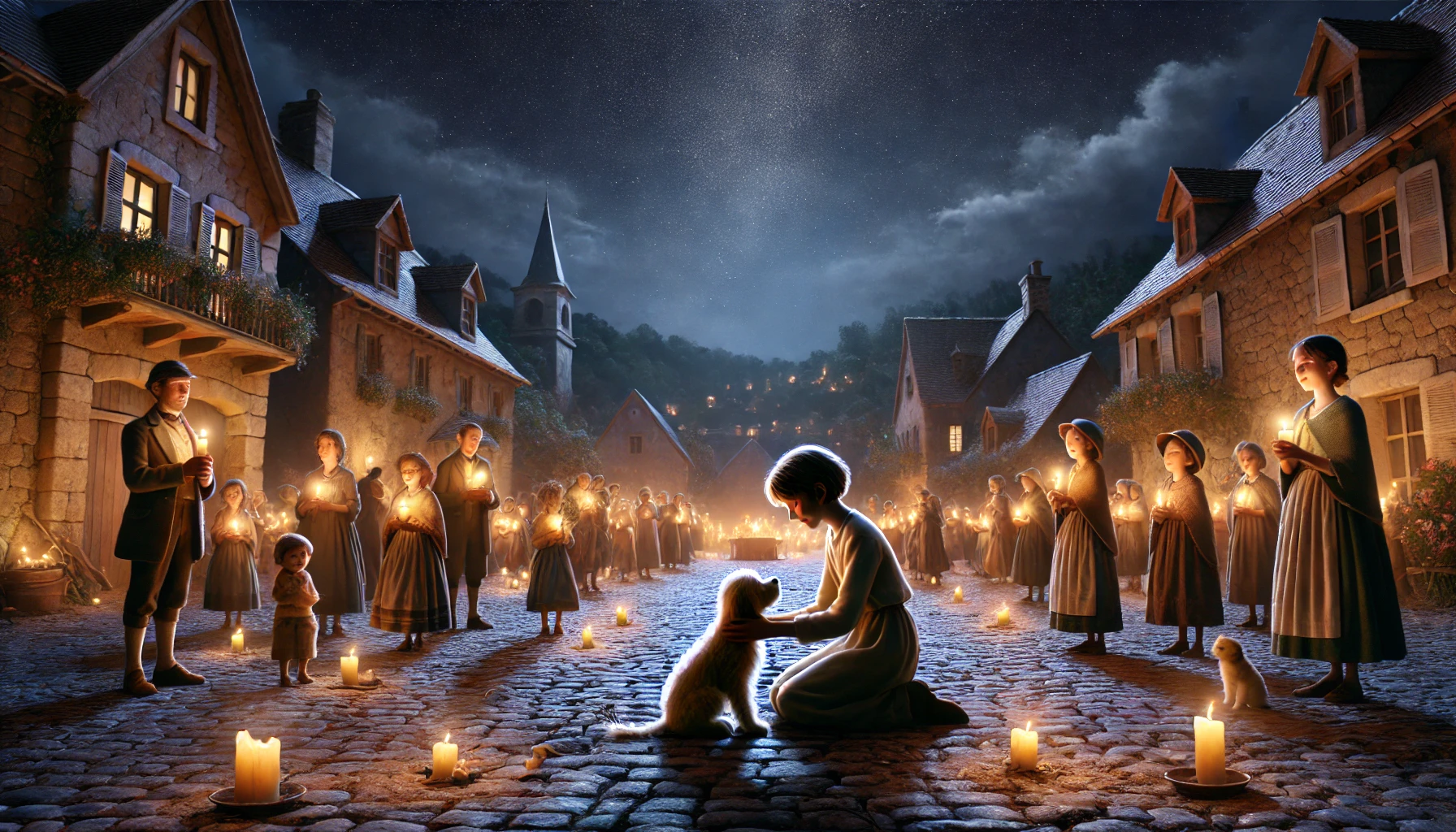 마을 광장은 금세 작은 불빛들로 가득 찼습니다. 사람들은 레미와 그의 가족 옆에서 함께 기다리며 따뜻한 말을 건넸습니다. 그 순간, 마치 마법처럼 미뇽의 짖는 소리가 들려왔습니다. 강아지는 숲 근처에서 길을 잃고 헤매다가, 광장의 불빛을 보고 돌아온 것이었습니다. 레미는 기쁨에 눈물을 흘리며 미뇽을 꼭 껴안았고, 마을 사람들은 환호성을 질렀습니다.