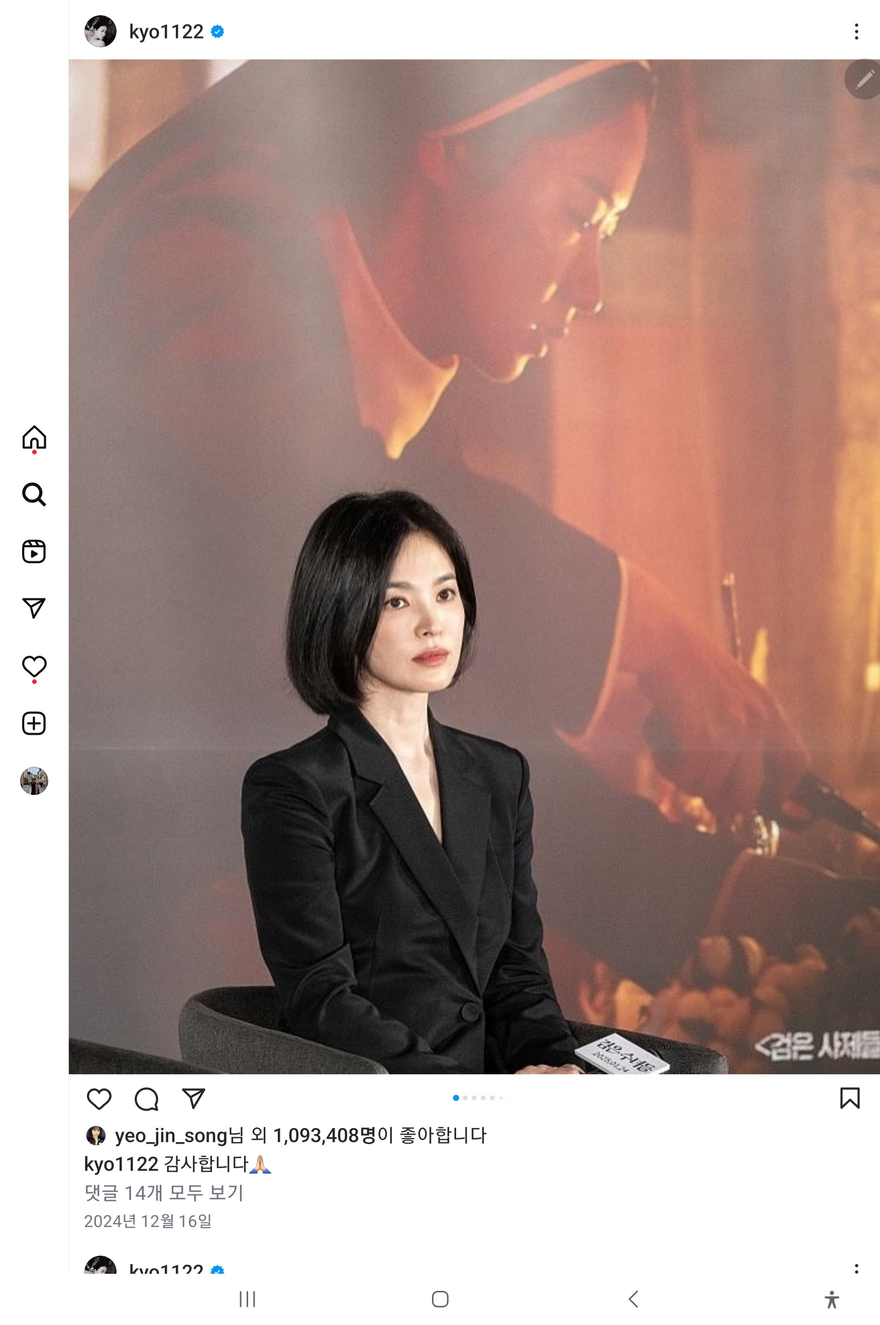 송혜교는 인스타그램(@kyo1122)을 통해 팬들과 활발히 소통하고 있습니다. 최근에는 '검은 수녀들' 촬영 현장 사진을 공개하며 팬들의 기대감을 높였죠.그녀의 SNS는 일상적인 모습부터 화보 촬영 비하인드, 영화 촬영 현장 등 다양한 콘텐츠로 가득합니다.
